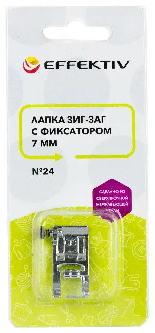 Лапка зиг-заг с фиксатором 7 мм EFFEKTIV № 24. Для безупречного прошивания плотных слоёв ткани на лапке имеется кнопка, которая фиксирует ее в горизонтальном положении. Это позволяет отрегулировать положение лапки, и игла не пропускает утолщения шва. Благодаря этому можно плавно прошивать тяжёлые ткани, а также ткани разной толщины. Эта особенность идеально подходит для лёгкого начала работы с плотными тканями. Конструкция лапки зиг-заг EFFEKTIV № 24 с фиксатором рассчитана на ее закрепление в универсальном держателе, которым оснащаются все модели швейных машин. Такая лапка применяется при шитье обычных материалов, для выполнения прямых строчек, или строчек зигзаг, а также большинства операций предусмотренных швейной машинкой. Лапка необходимый аксессуар, так как позволяет не только стачивать детали, но и выполнять красивые декоративные швы. Особенно нарядно выглядят изделия с оборками, когда строчка выполнена в виде зигзага.