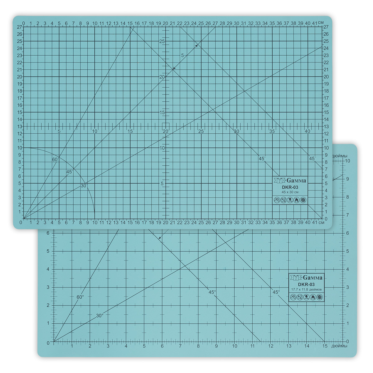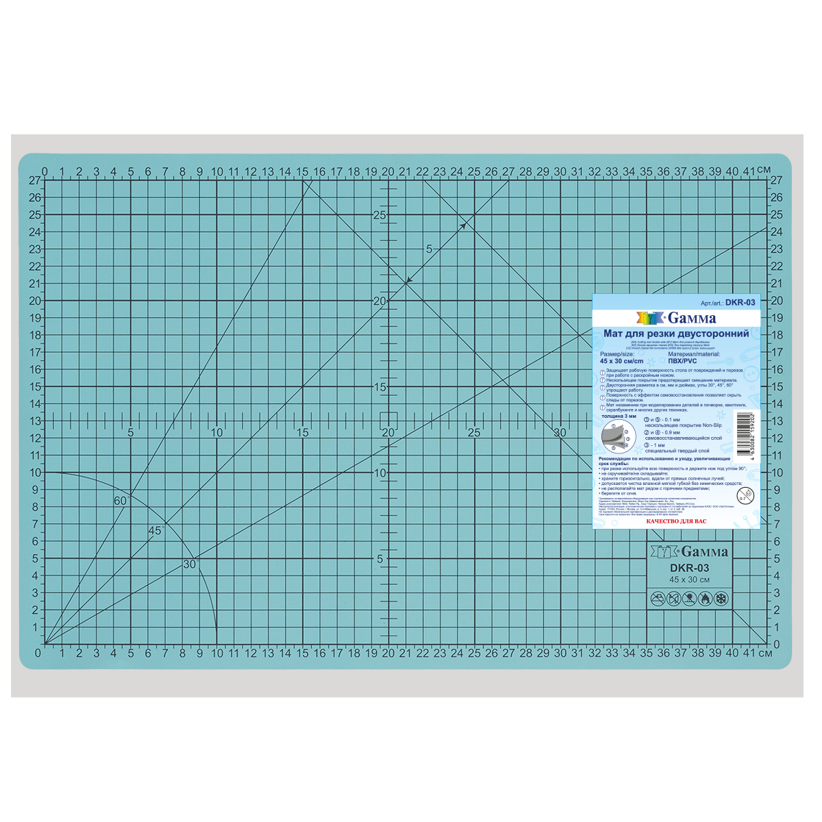 На коврике нанесена двусторонняя разметка в см, мм и дюймах, углы 30°, 45°, 60° упрощают работу.